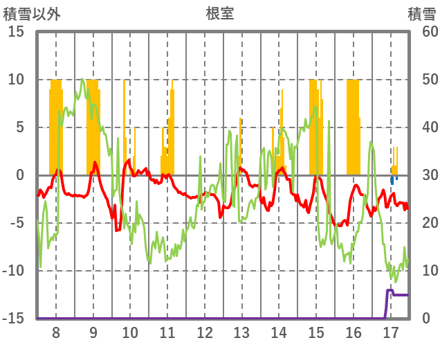 | 日 | 時 | 気温 | 降水 | 風向/風速 | 日照 | 積雪 | 降雪 |