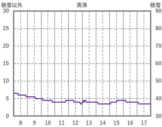 | 日 | 時 | 気温 | 降水 | 風向/風速 | 日照 | 積雪 | 降雪 |