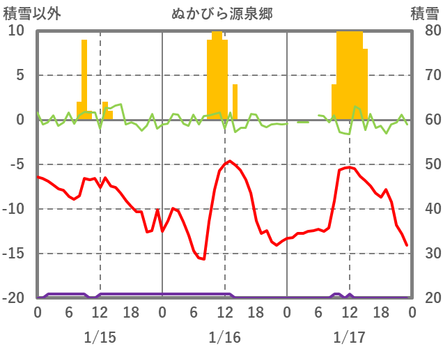 | 日 | 時 | 気温 | 降水 | 風向/風速 | 日照 | 積雪 | 降雪 |
