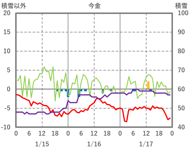 | 日 | 時 | 気温 | 降水 | 風向/風速 | 日照 | 積雪 | 降雪 |