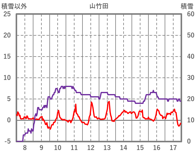 | 日 | 時 | 気温 | 降水 | 風向/風速 | 日照 | 積雪 | 降雪 |