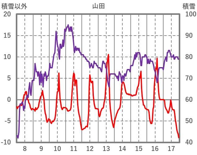 | 日 | 時 | 気温 | 降水 | 風向/風速 | 日照 | 積雪 | 降雪 |