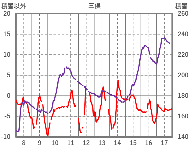 | 日 | 時 | 気温 | 降水 | 風向/風速 | 日照 | 積雪 | 降雪 |