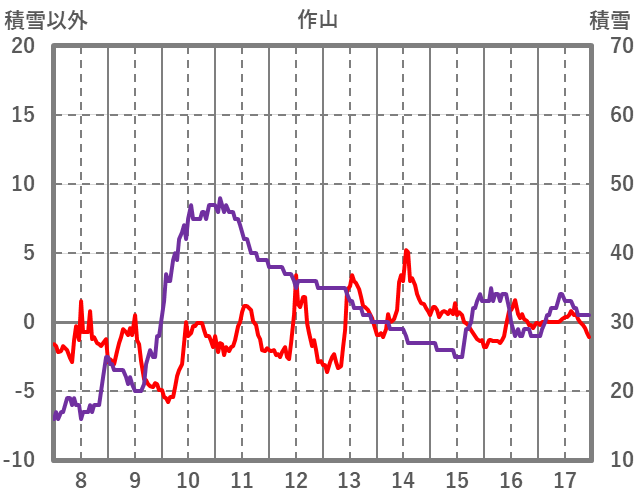 | 日 | 時 | 気温 | 降水 | 風向/風速 | 日照 | 積雪 | 降雪 |