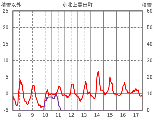 | 日 | 時 | 気温 | 降水 | 風向/風速 | 日照 | 積雪 | 降雪 |