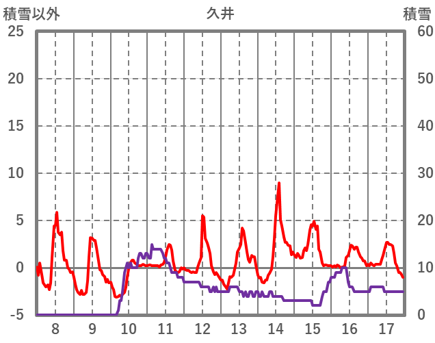 | 日 | 時 | 気温 | 降水 | 風向/風速 | 日照 | 積雪 | 降雪 |