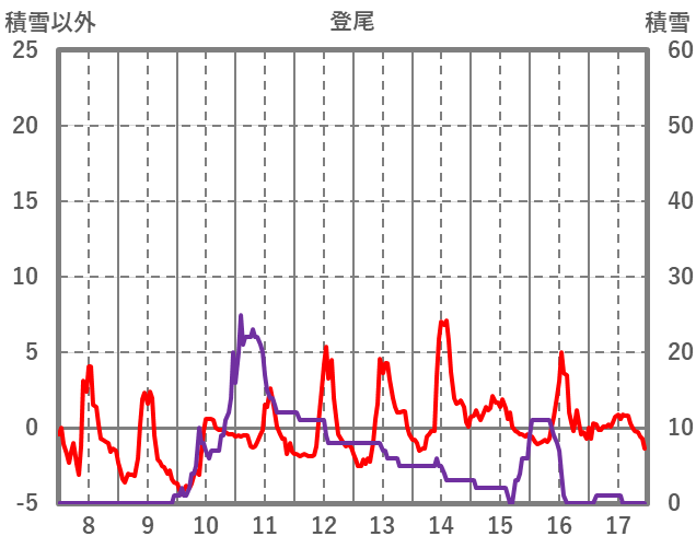 | 日 | 時 | 気温 | 降水 | 風向/風速 | 日照 | 積雪 | 降雪 |