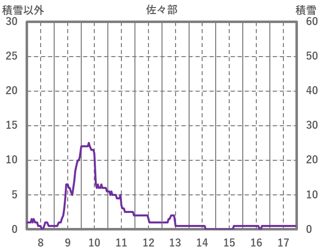 | 日 | 時 | 気温 | 降水 | 風向/風速 | 日照 | 積雪 | 降雪 |