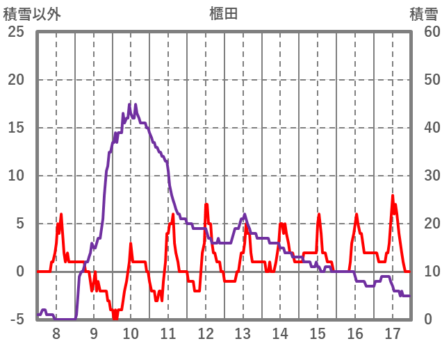 | 日 | 時 | 気温 | 降水 | 風向/風速 | 日照 | 積雪 | 降雪 |