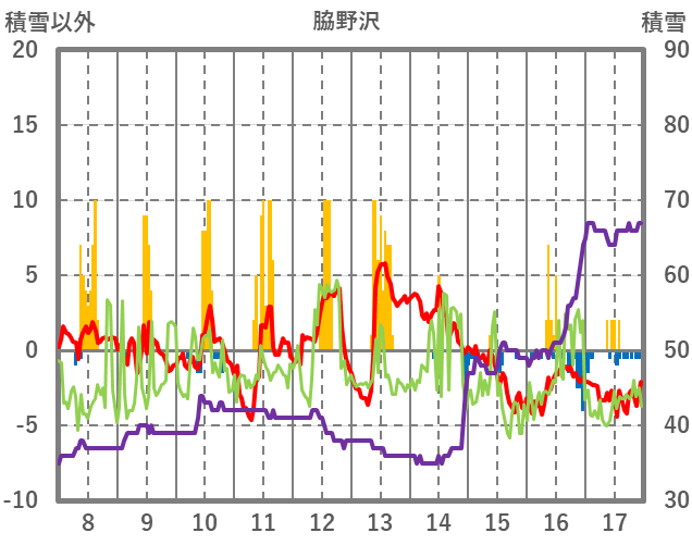 | 日 | 時 | 気温 | 降水 | 風向/風速 | 日照 | 積雪 | 降雪 |