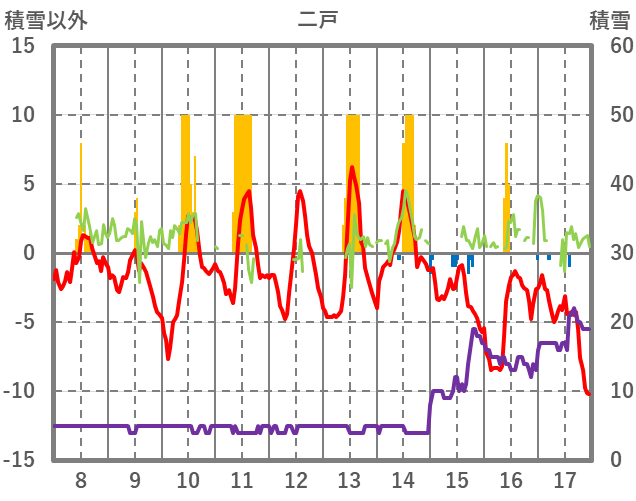 | 日 | 時 | 気温 | 降水 | 風向/風速 | 日照 | 積雪 | 降雪 |