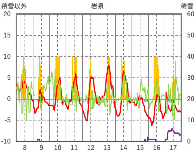 | 日 | 時 | 気温 | 降水 | 風向/風速 | 日照 | 積雪 | 降雪 |