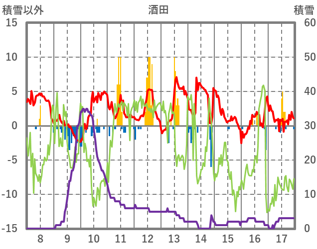 | 日 | 時 | 気温 | 降水 | 風向/風速 | 日照 | 積雪 | 降雪 |