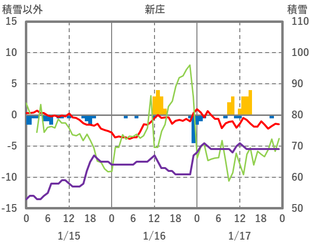 | 日 | 時 | 気温 | 降水 | 風向/風速 | 日照 | 積雪 | 降雪 |