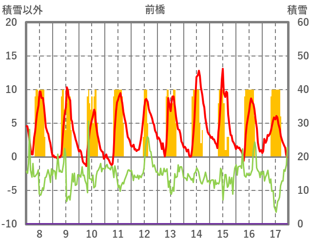 | 日 | 時 | 気温 | 降水 | 風向/風速 | 日照 | 積雪 | 降雪 |