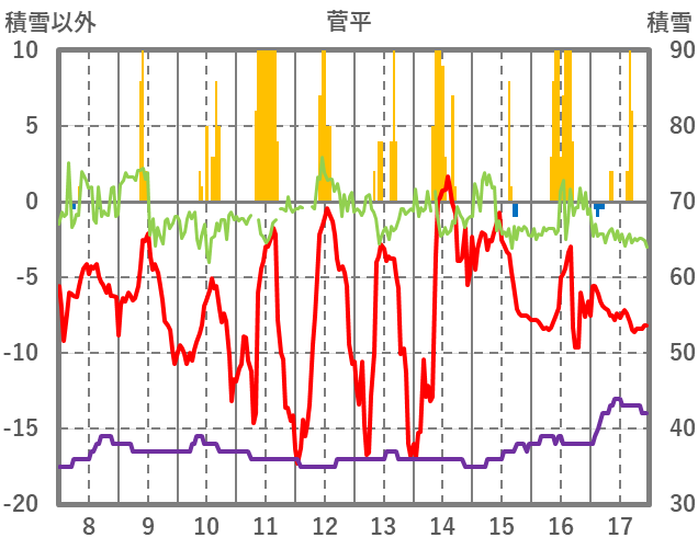 | 日 | 時 | 気温 | 降水 | 風向/風速 | 日照 | 積雪 | 降雪 |