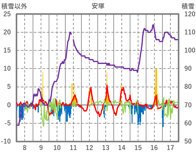 | 日 | 時 | 気温 | 降水 | 風向/風速 | 日照 | 積雪 | 降雪 |