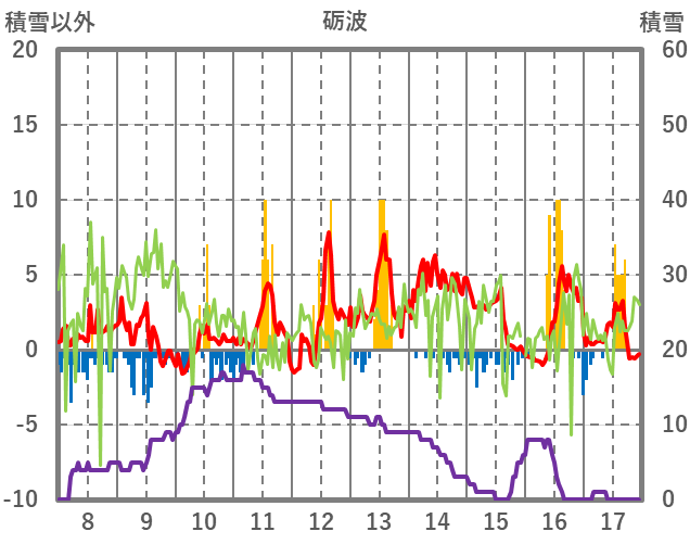 | 日 | 時 | 気温 | 降水 | 風向/風速 | 日照 | 積雪 | 降雪 |