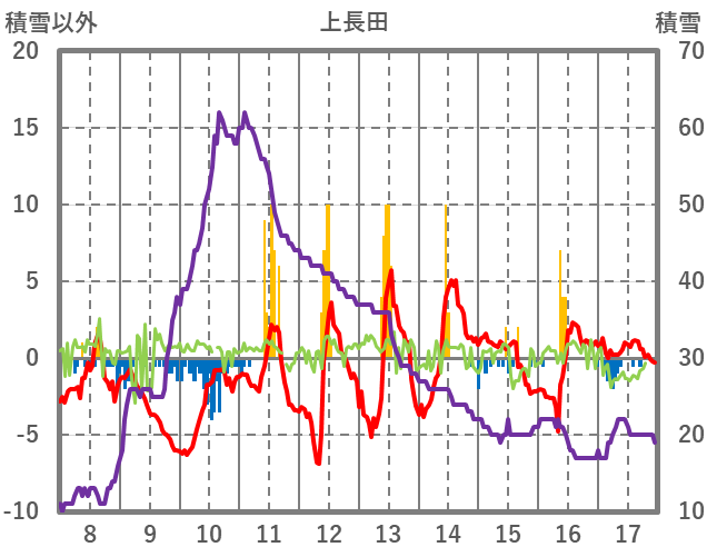 | 日 | 時 | 気温 | 降水 | 風向/風速 | 日照 | 積雪 | 降雪 |