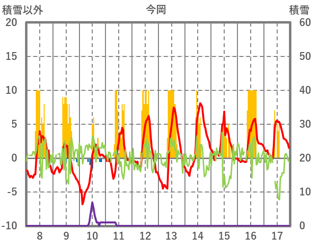 | 日 | 時 | 気温 | 降水 | 風向/風速 | 日照 | 積雪 | 降雪 |