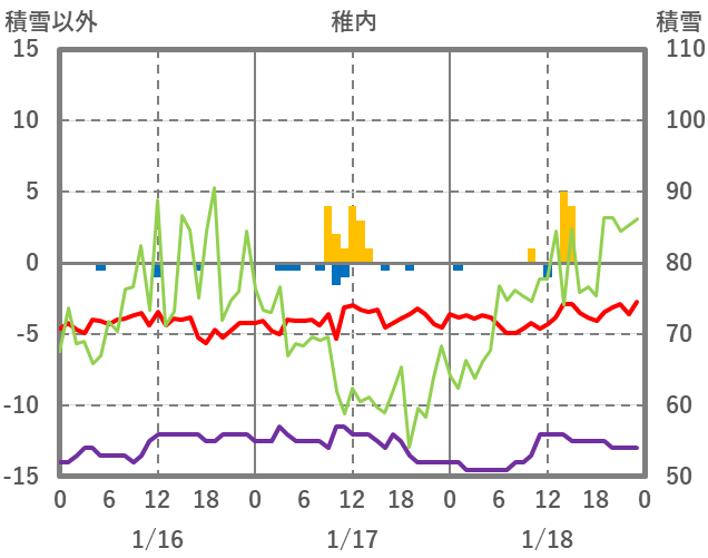 | 日 | 時 | 気温 | 降水 | 風向/風速 | 日照 | 積雪 | 降雪 |