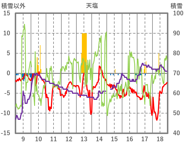 | 日 | 時 | 気温 | 降水 | 風向/風速 | 日照 | 積雪 | 降雪 |