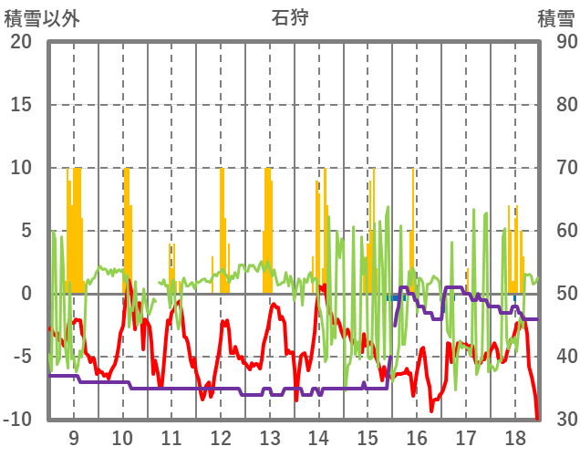 | 日 | 時 | 気温 | 降水 | 風向/風速 | 日照 | 積雪 | 降雪 |