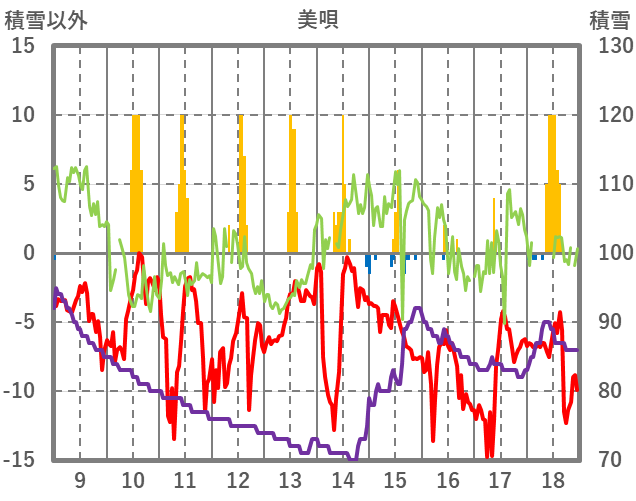 | 日 | 時 | 気温 | 降水 | 風向/風速 | 日照 | 積雪 | 降雪 |