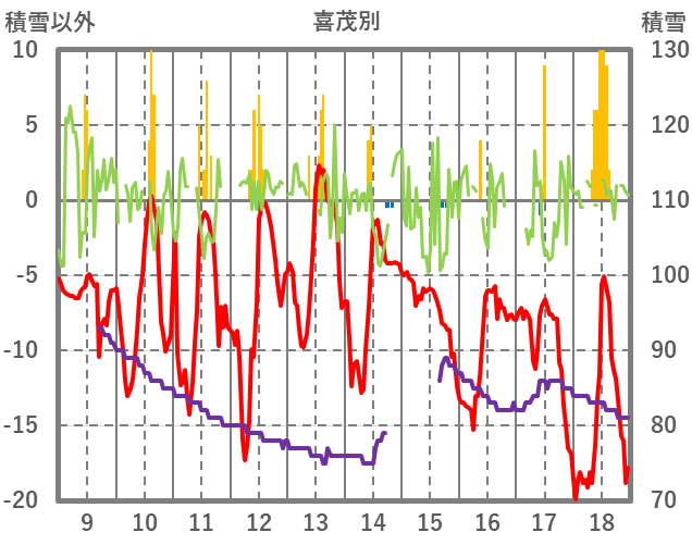 | 日 | 時 | 気温 | 降水 | 風向/風速 | 日照 | 積雪 | 降雪 |