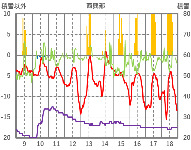| 日 | 時 | 気温 | 降水 | 風向/風速 | 日照 | 積雪 | 降雪 |