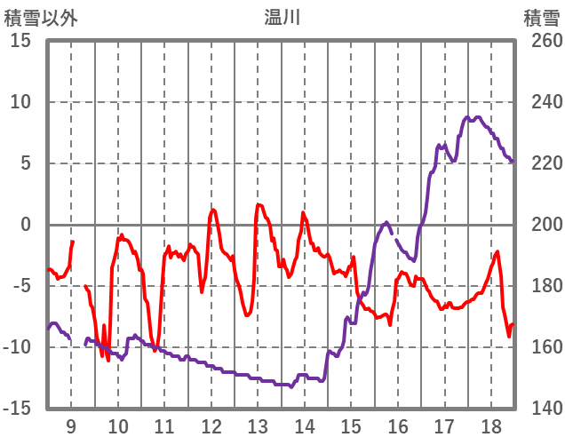 | 日 | 時 | 気温 | 降水 | 風向/風速 | 日照 | 積雪 | 降雪 |