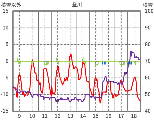 | 日 | 時 | 気温 | 降水 | 風向/風速 | 日照 | 積雪 | 降雪 |