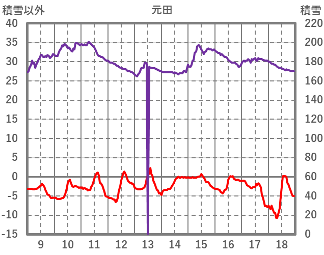 | 日 | 時 | 気温 | 降水 | 風向/風速 | 日照 | 積雪 | 降雪 |