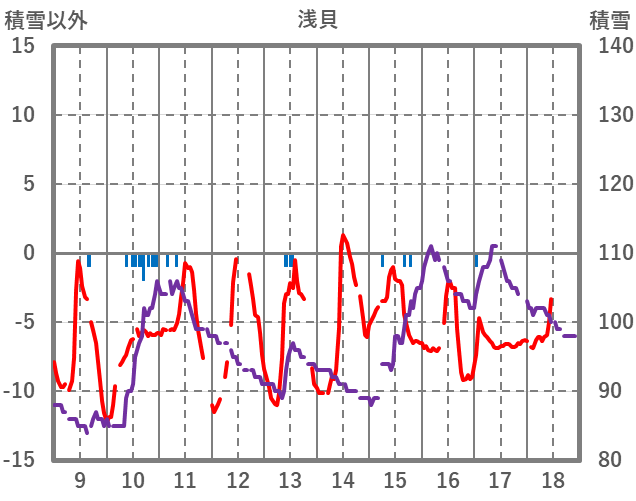| 日 | 時 | 気温 | 降水 | 風向/風速 | 日照 | 積雪 | 降雪 |