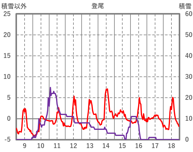 | 日 | 時 | 気温 | 降水 | 風向/風速 | 日照 | 積雪 | 降雪 |