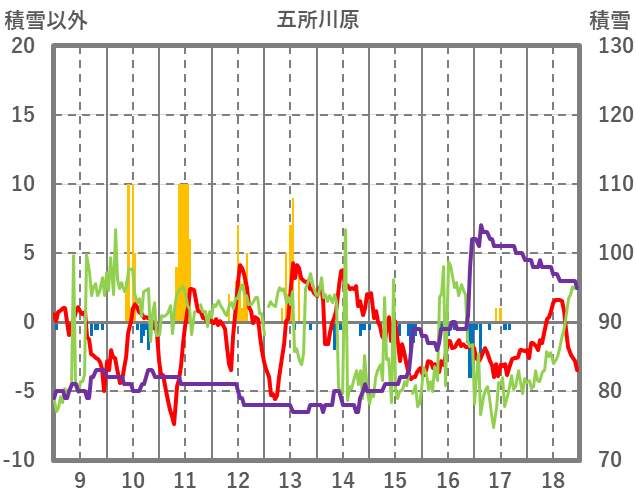 | 日 | 時 | 気温 | 降水 | 風向/風速 | 日照 | 積雪 | 降雪 |