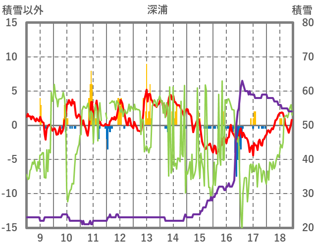 | 日 | 時 | 気温 | 降水 | 風向/風速 | 日照 | 積雪 | 降雪 |