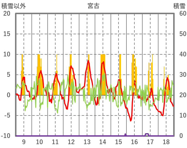 | 日 | 時 | 気温 | 降水 | 風向/風速 | 日照 | 積雪 | 降雪 |