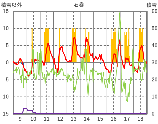 | 日 | 時 | 気温 | 降水 | 風向/風速 | 日照 | 積雪 | 降雪 |