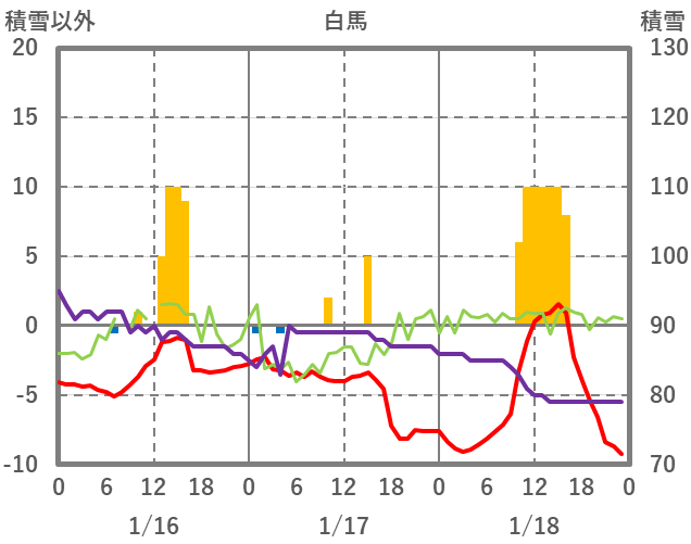 | 日 | 時 | 気温 | 降水 | 風向/風速 | 日照 | 積雪 | 降雪 |