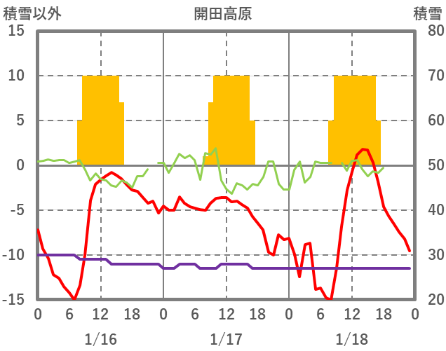 | 日 | 時 | 気温 | 降水 | 風向/風速 | 日照 | 積雪 | 降雪 |