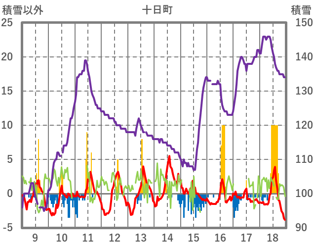 | 日 | 時 | 気温 | 降水 | 風向/風速 | 日照 | 積雪 | 降雪 |