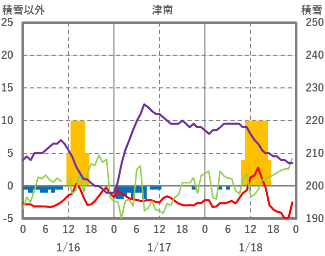 | 日 | 時 | 気温 | 降水 | 風向/風速 | 日照 | 積雪 | 降雪 |