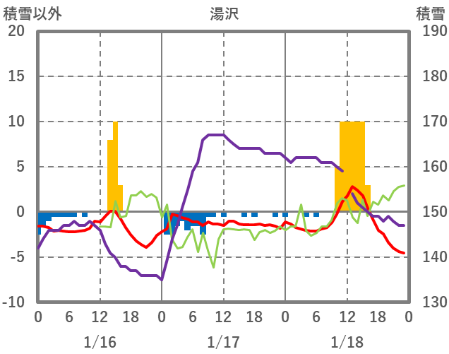 | 日 | 時 | 気温 | 降水 | 風向/風速 | 日照 | 積雪 | 降雪 |