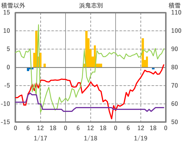 | 日 | 時 | 気温 | 降水 | 風向/風速 | 日照 | 積雪 | 降雪 |