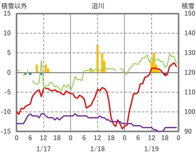 | 日 | 時 | 気温 | 降水 | 風向/風速 | 日照 | 積雪 | 降雪 |