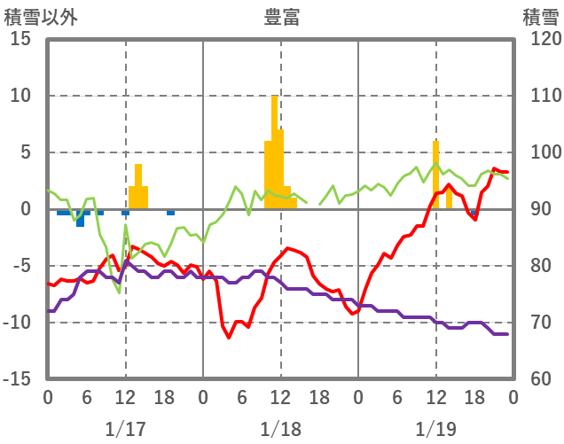 | 日 | 時 | 気温 | 降水 | 風向/風速 | 日照 | 積雪 | 降雪 |