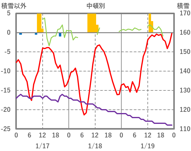 | 日 | 時 | 気温 | 降水 | 風向/風速 | 日照 | 積雪 | 降雪 |