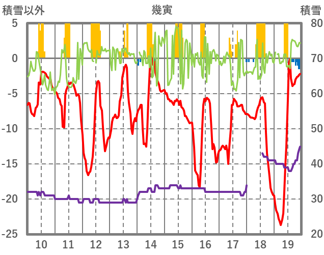 | 日 | 時 | 気温 | 降水 | 風向/風速 | 日照 | 積雪 | 降雪 |
