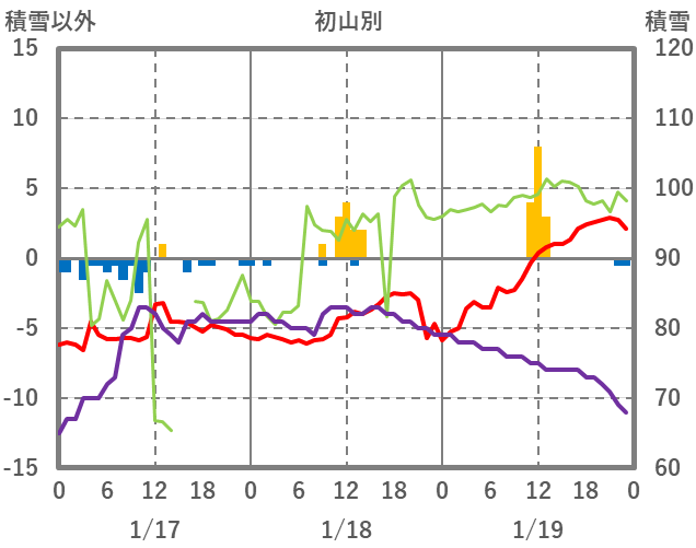 | 日 | 時 | 気温 | 降水 | 風向/風速 | 日照 | 積雪 | 降雪 |